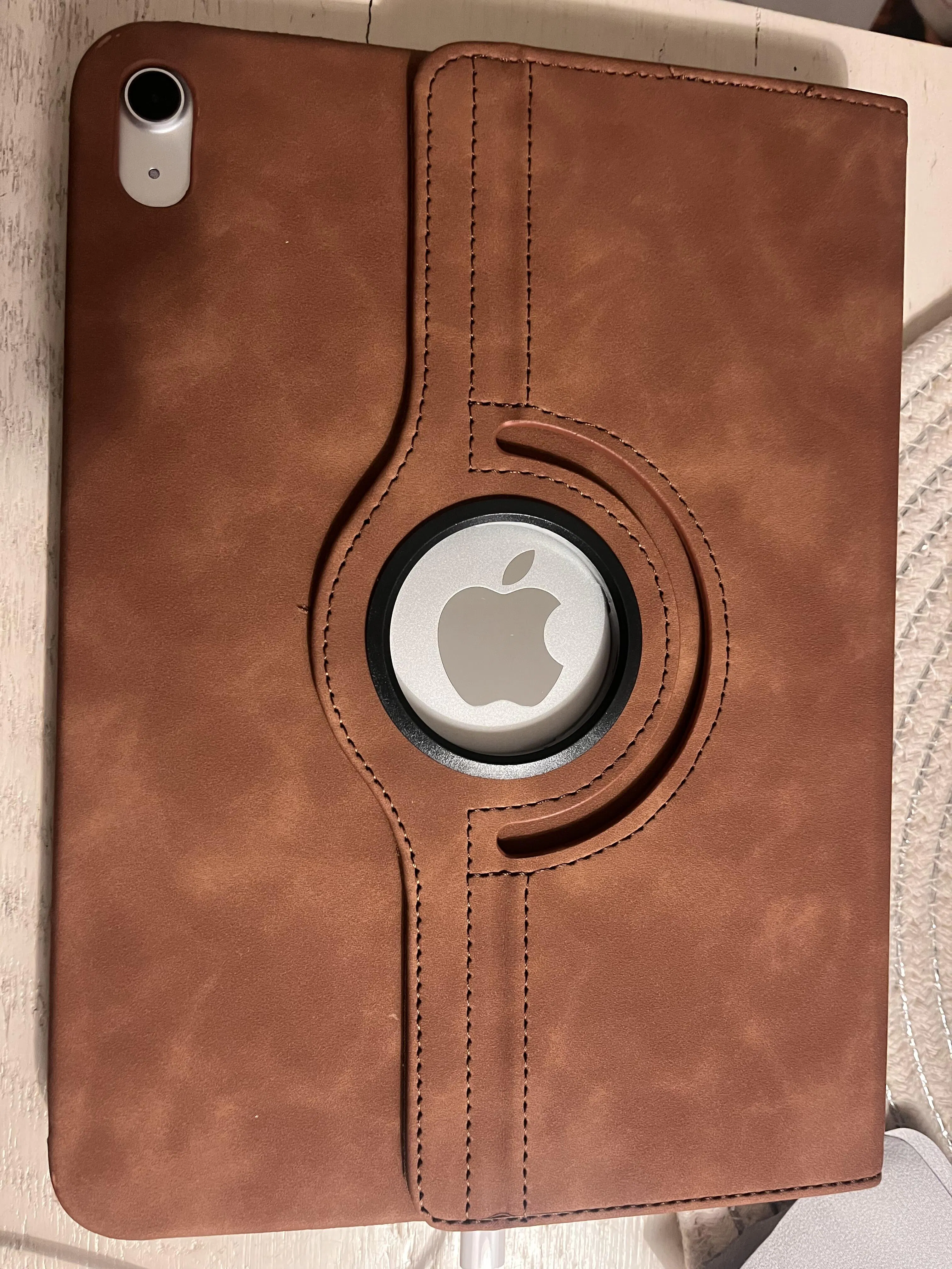 Brown 360-degree rotating case for Apple iPad 2022, showcasing multiple views and card slots.